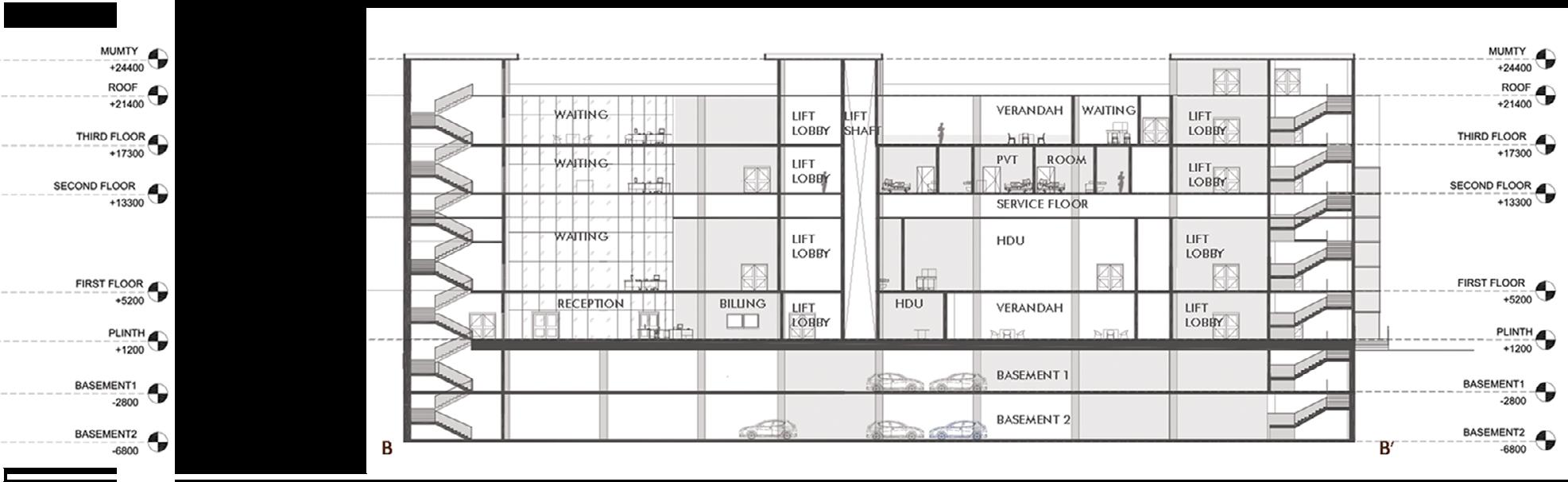 The design focuses on creating semi-built spaces which allow for flexible and quick expansion in the hospital. This done on a micro as well as macro level. With adaptable rooms and wings