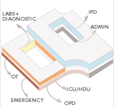 The design focuses on creating semi-built spaces which allow for flexible and quick expansion in the hospital. This done on a micro as well as macro level.