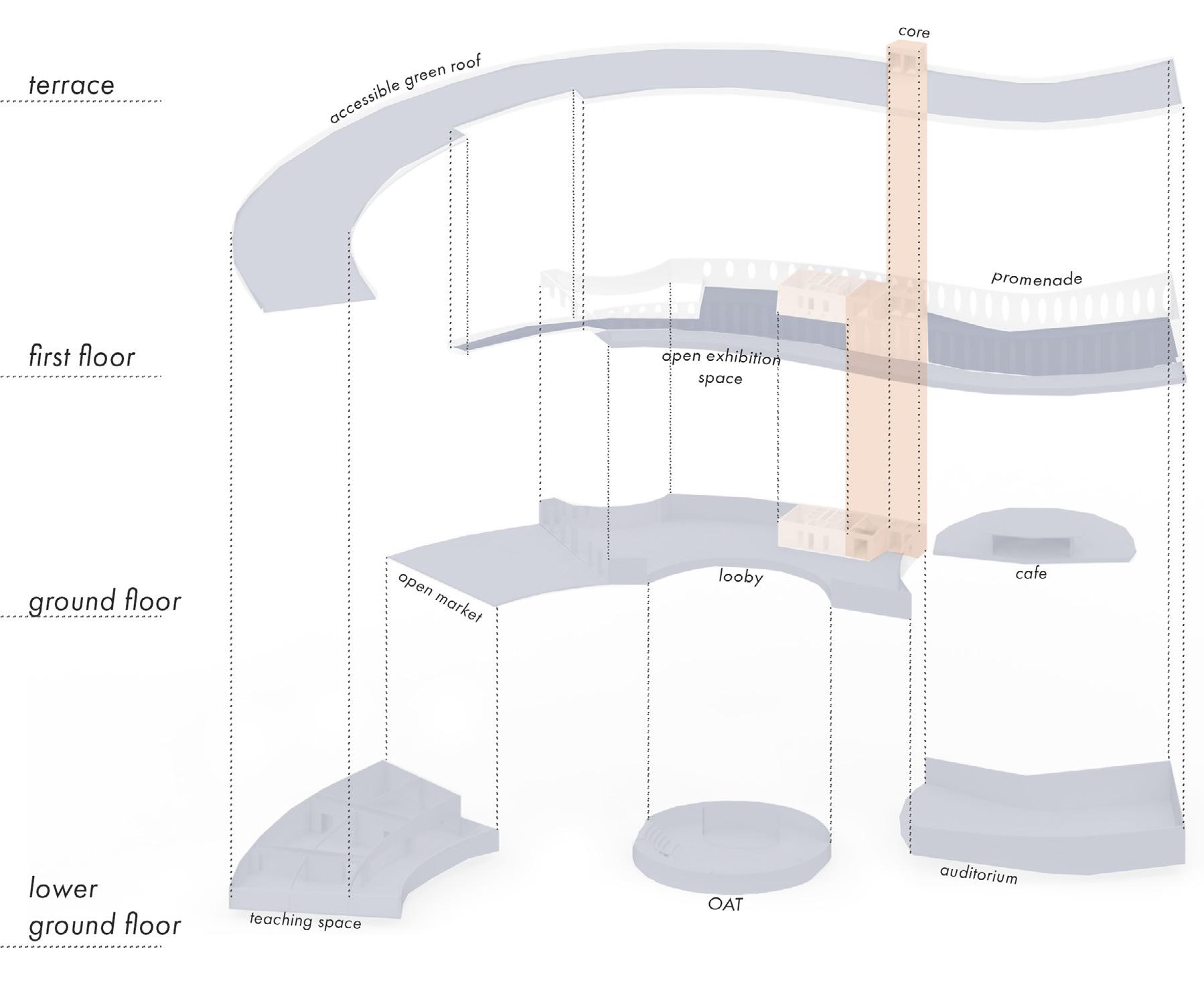 All areas are designed as multifunctional, keeping in mind potential change in need in the future. The lower ground level has spaces with regular footfall, the ground floor is a public space, the first floor promenade acts as commercial space.