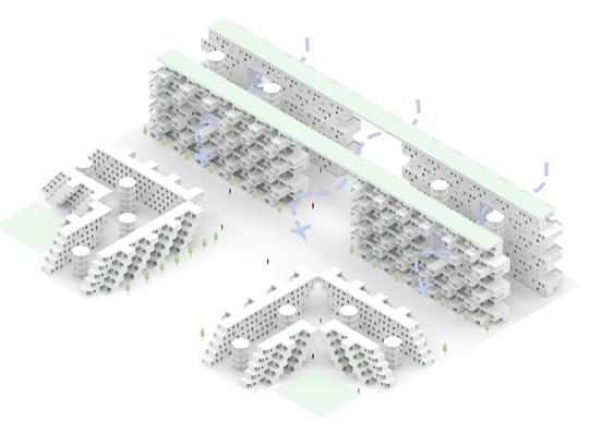 The mass is divided along cardinal directions to ensure clear accessibility. The streets imitate the traditional linear markets social space. Building’s to the weat are raised to self shade the street. Finally terraces and punctures are created to facilitate wind flow and create vertical green spaces.