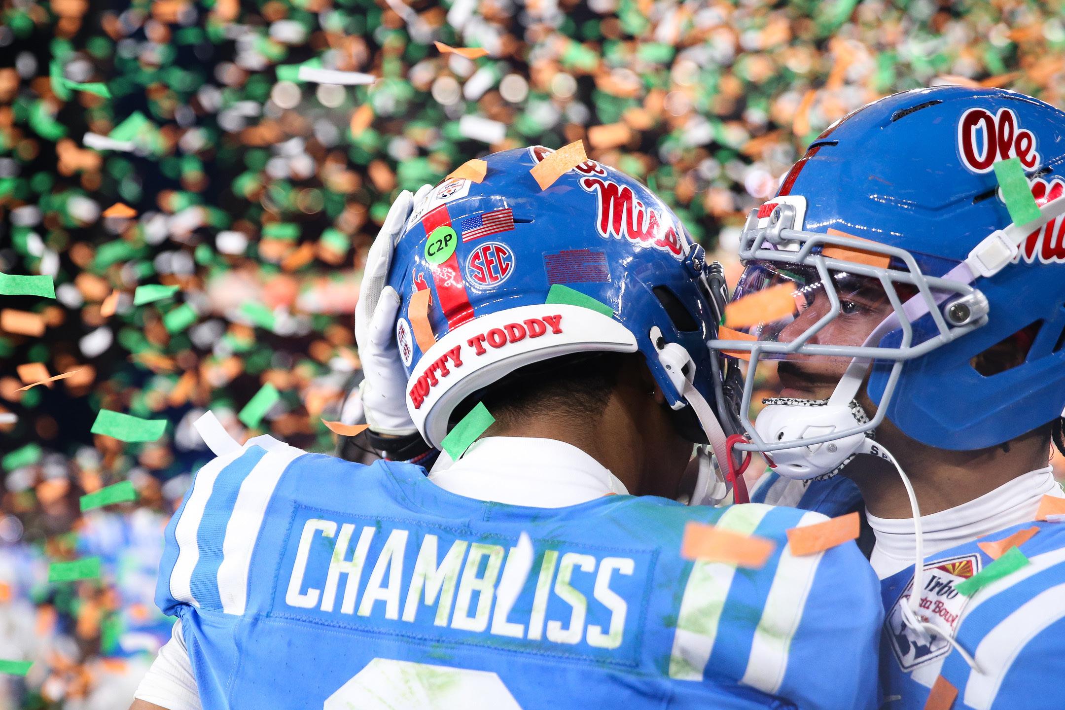 CHARLIE RAMIREZ | THE DAILY WILDCAT CARSON BECK SCORES THE game winning touchdown against Ole Miss in State Farm Stadium in Glendale, Ariz. on Jan. 8.