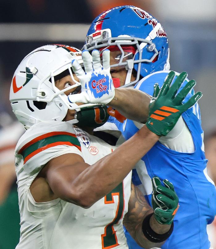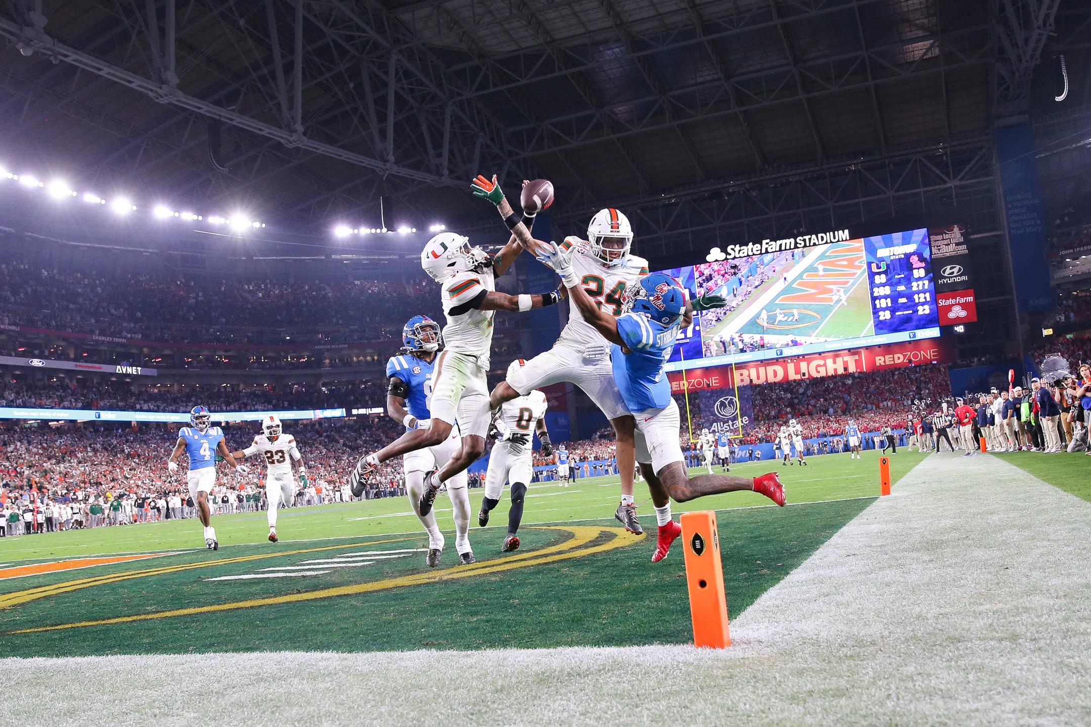 THE FINAL PLAY OF the 2026 Fiesta Bowl is broken up in the end zone to send Miami to the National Championship in State Farm Stadium in Glendale, Ariz. on Jan. 8.