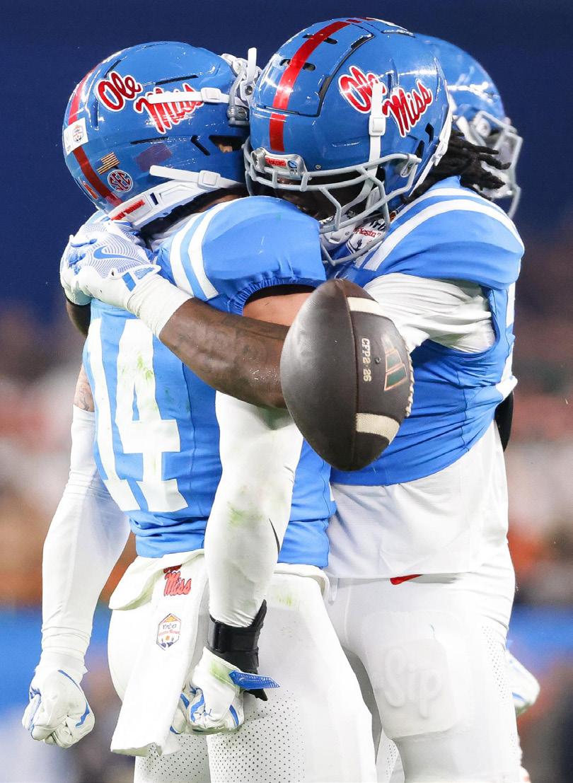 CHARLIE RAMIREZ | THE DAILY WILDCAT CJ DANIELS (7) ATTEMPTS to catch a heavily contested pass against Ole Miss in State Farm Stadium during the Fiesta Bowl in Glendale, Ariz. on Jan. 8.