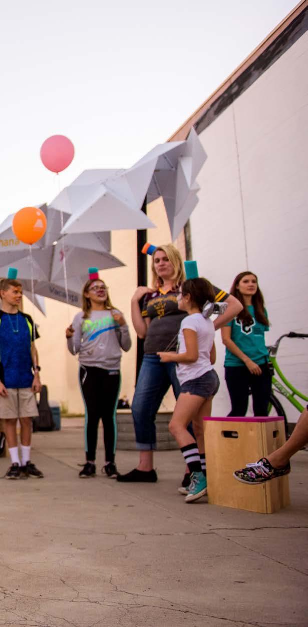 At the Pause + Play installation in Mesa, design and architecture students designed and built an installation for the first Prototyping Festival for the City of Mesa. Unlike most projects that often apply a top-down approach, the professor and students proposed to prototype the process rather than the object. They partnered with Porter Elementary, a Title I school in the city of Mesa school district, collaborating with 75 sixth graders to design the installation.