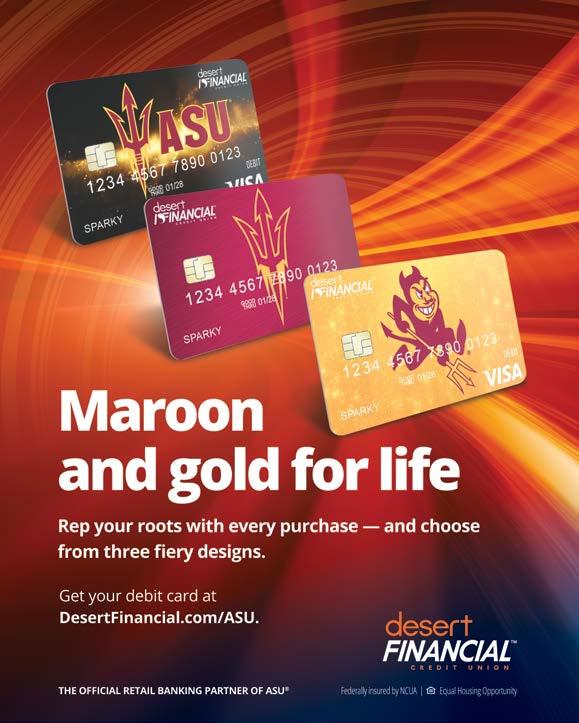 ASU Thrive (USPS 024-438; ISSN 1940-2929) is published quarterly by Arizona State University Enterprise Brand Strategy and Management, 660 S Mill Ave, Centerpoint Suite 401, Tempe, AZ 85281, 480-727-5440. Subscriptions are sent to all ASU alumni. For detailed information about supporting alumni traditions, scholarships and programs, visit alumni.asu.edu/give-back/donate Periodicals postage is paid at Tempe, Arizona, and additional mailing offices. Postmaster: Please send address changes to ASU Thrive, Attention: Circulation, PO Box 875011, Tempe, AZ 852875011. Permissions: Portions of this publication may be reprinted with the written permission and proper attribution by contacting the ASU Thrive editor. ASU Th rive can be accessed online at news.asu.edu/thrive-magazine