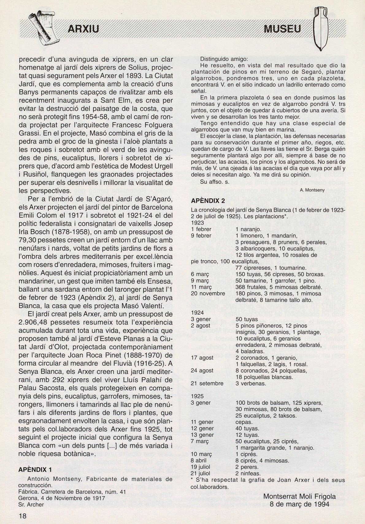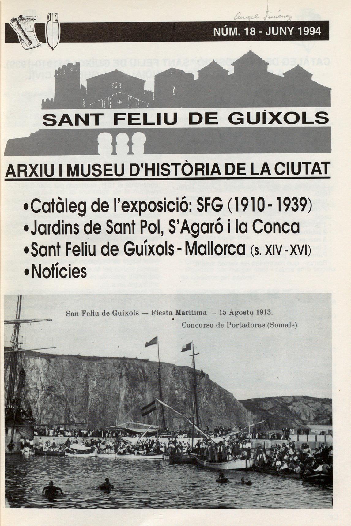 < NÚM. 18 JUNY 1994 SANT FELIU DE GUíXOLS ARXIU I MUSEU D'HISTÒRIA DE LA CIUTAT 'Catàleg de l'exposició: SFG (1910-1939) 'Jardins de Sant Pol, S'Agaró i la Conca • Sant Feliu de Guíxols Mallorca (s. XIV XVI) ·Notícies. San Feliu de Guixols Fiesta MariLima 15 Agosto 1913. Concurso de Portadoras (Somals)