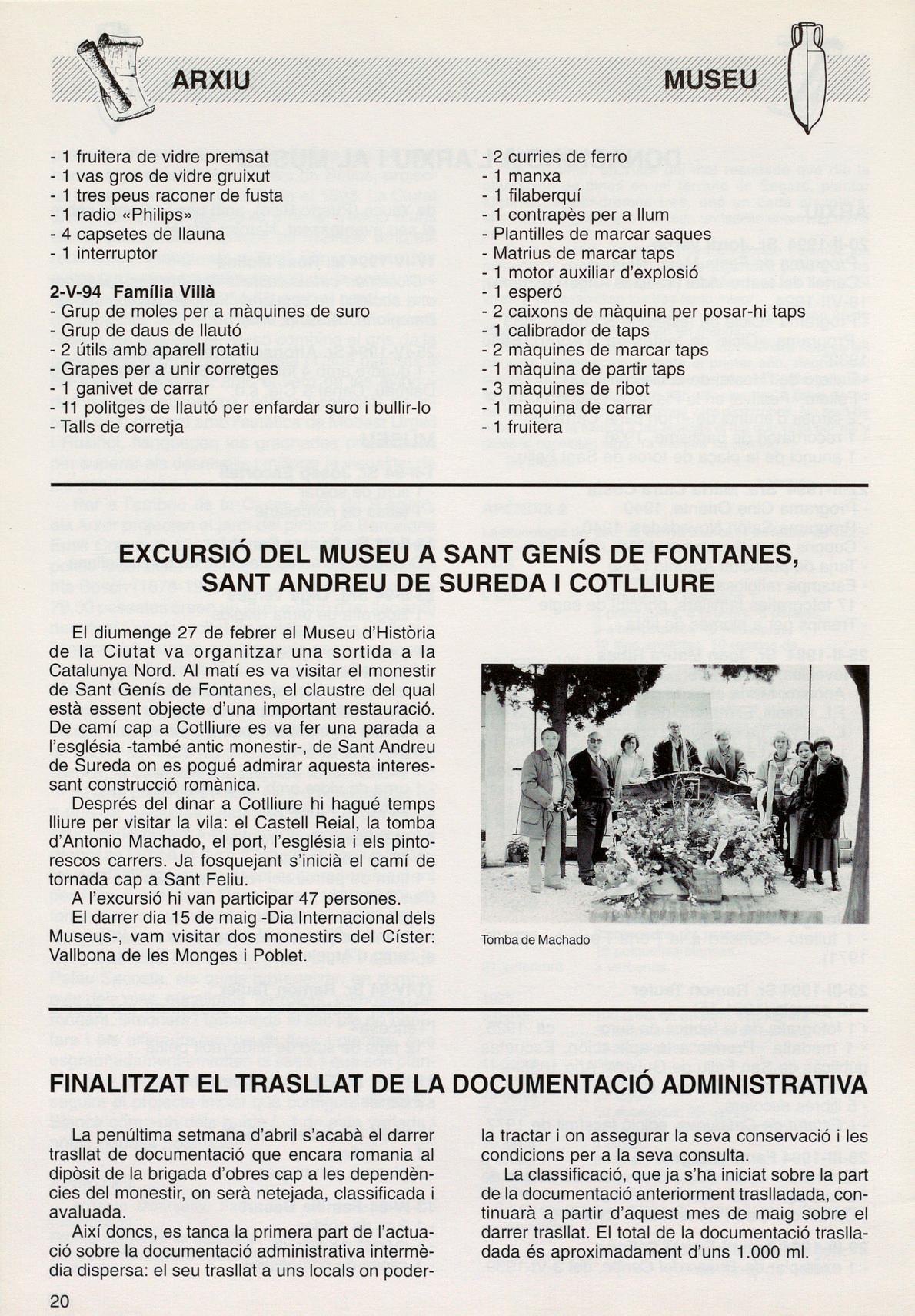 El diumenge 27 de febrer el Museu d'Història de la Ciutat va organitzar una sortida a la Catalunya Nord. AI matí es va visitar el monestir de Sant Genís de Fontanes, el claustre del qual està essent objecte d'una important restauració. De camí cap a Cotlliure es va fer una parada a l'església -també antic monestir-, de Sant Andreu de Sureda on es pogué admirar aquesta interessant construcció romànica.
