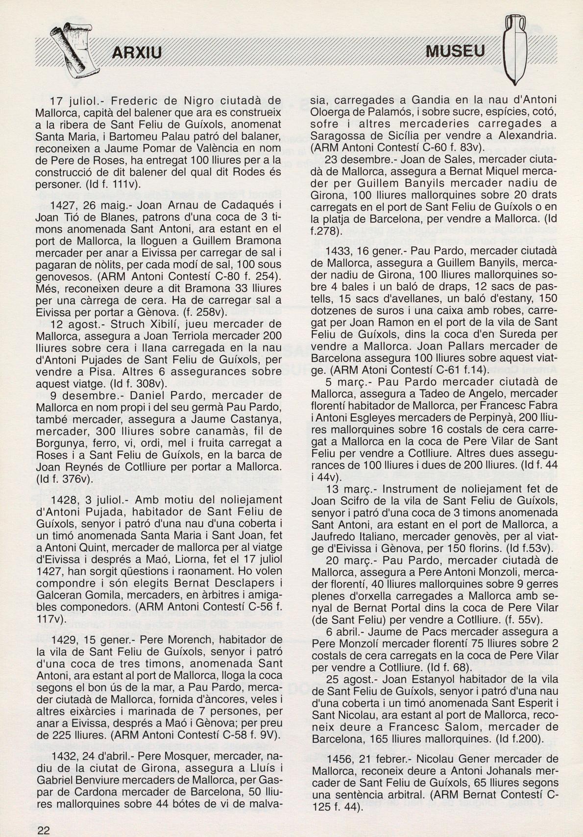 1433, 16 gener.- Pau Pardo, mercader ciutadà de Mallorca, assegura a Guillem Banyils, mercader nadiu de Girona, 100 lliures mallorquines sobre 4 bales i un baló de draps, 12 sacs de pastells, 15 sacs d'avellanes, un baló d'estany, 150 dotzenes de suros i una caixa amb robes, carregat per Joan Ramon en el port de la vila de Sant Feliu de Guíxols, dins la coca d'en Sureda per vendre a Mallorca. Joan Pallars mercader de Barcelona assegura 100 lliures sobre aquest viatge. (ARM Atoni Contestí C-61 f.14).
