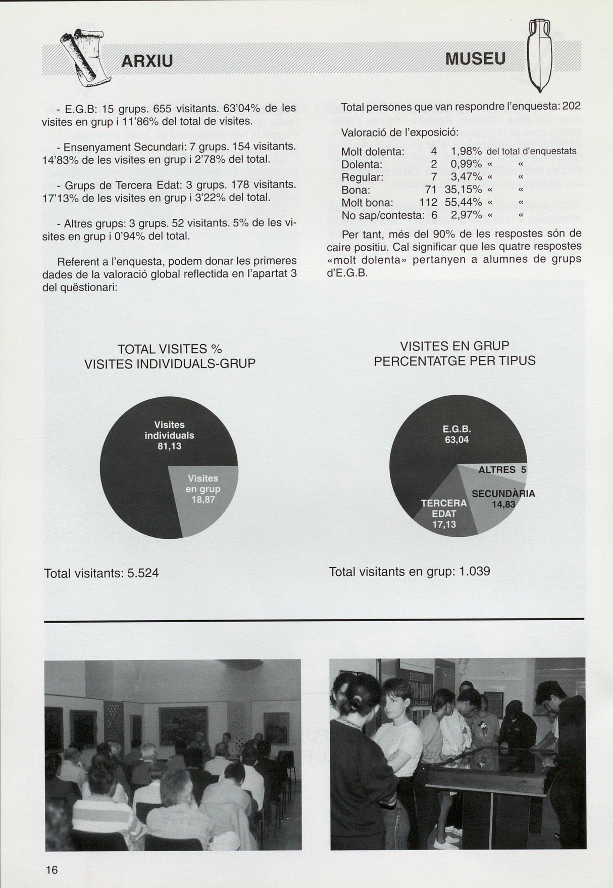 E.G.B: 15 grups. 655 visitants. 63'04% de les visites en grup 11 '86% del total de visites.