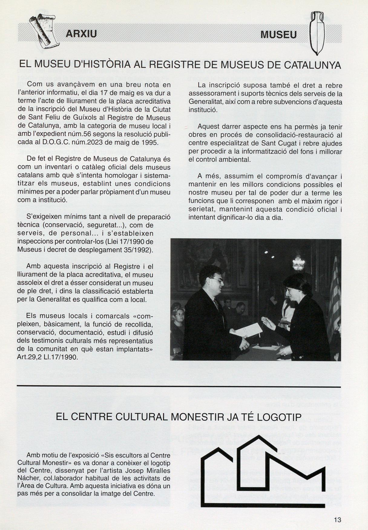 Com us avançàvem en una breu nota en l'anterior informatiu, el dia 17 de maig es va dur a terme l'acte de lliurament de la placa acreditativa de la inscripció del Museu d'Història de la Ciutat de Sant Feliu de Guíxols al Registre de Museus de Catalunya, amb la categoria de museu local i amb l'expedient núm.56 segons la resolució publicada al D.O.G.C. núm.2023 de maig de 1995.