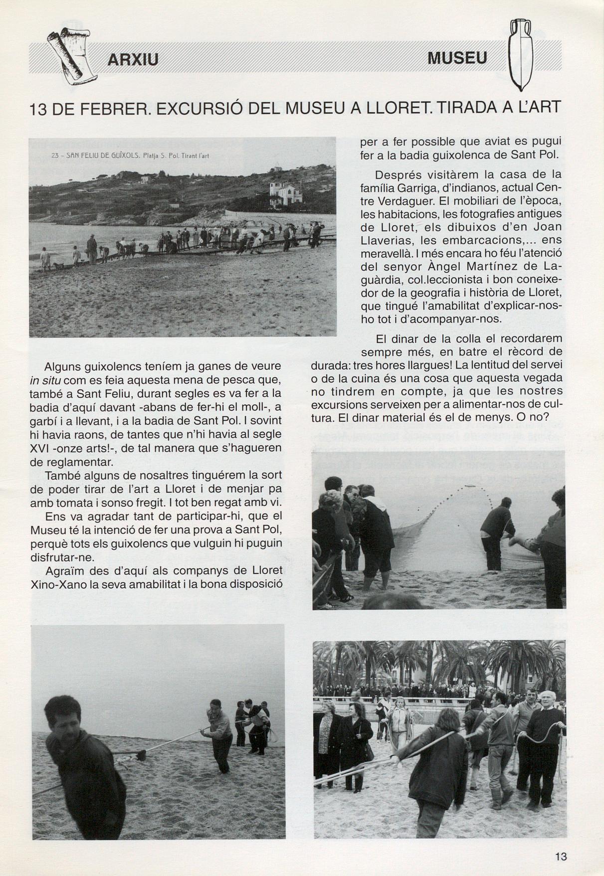 Alguns guixolencs teníem ja ganes de veure in situ com es feia aquesta mena de pesca que, també a Sant Feliu, durant segles es va fer a la badia d'aquí davant -abans de fer-hi el moll-, a garbí i a llevant, a la badia de Sant Pol. I sovint hi havia raons, de tantes que n'hi havia al segle XVI -onze arts!-, de tal manera que s'hagueren de reglamentar.