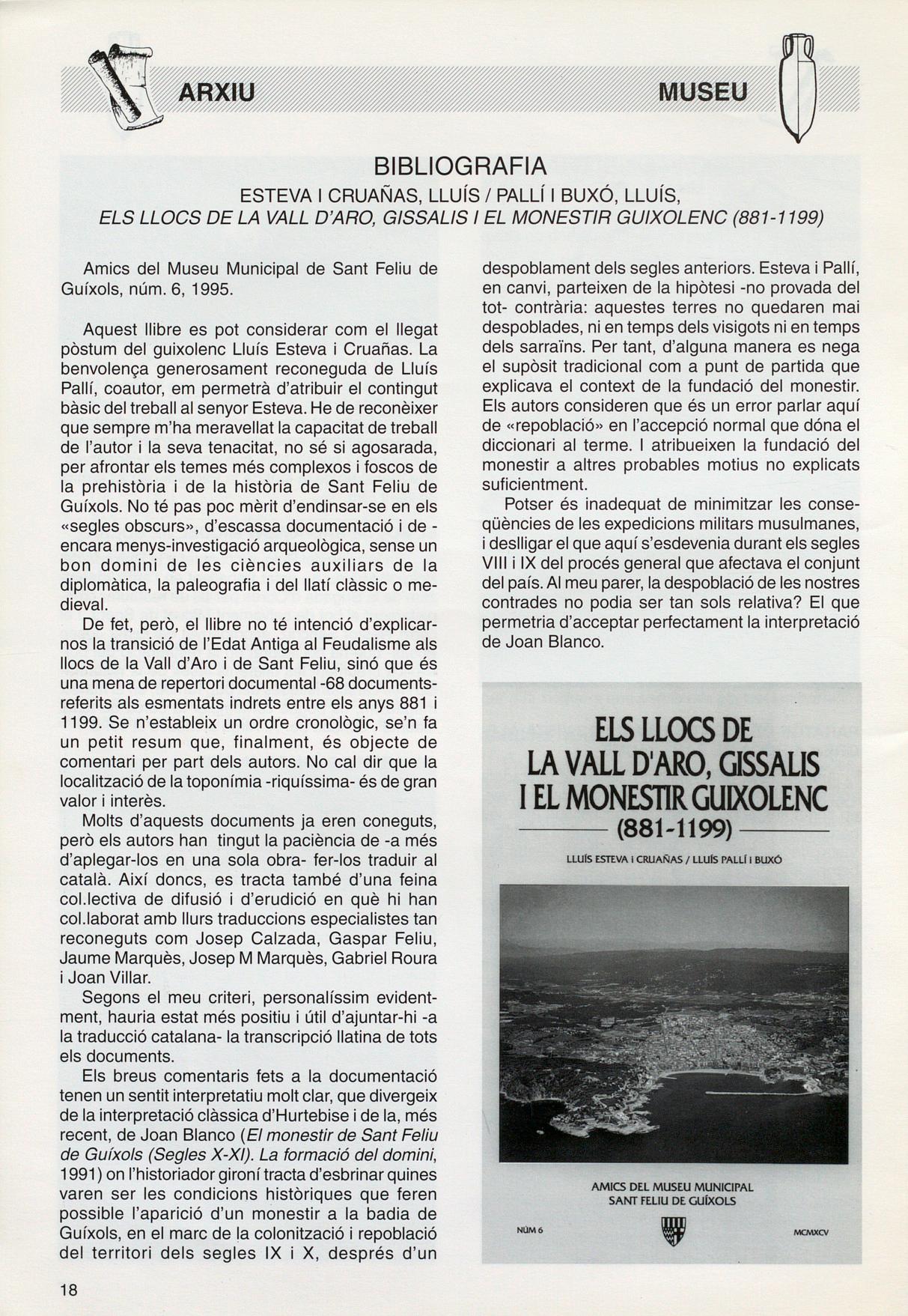 Aquest llibre es pot considerar com el llegat pòstum del guixolenc Lluís Esteva i Cruañas. La benvolença generosament reconeguda de Lluís Pallí, coautor, em permetrà d'atribuir el contingut bàsic del treball al senyor Esteva. He de reconèixer que sempre m'ha meravellat la capacitat de treball de l'autor la seva tenacitat, no sé si agosarada, per afrontar els temes més complexos foscos de la prehistòria de la història de Sant Feliu de Guíxols. No té pas poc mèrit d'endinsar-se en els «segles obscurs», d'escassa documentació de encara menys-investigació arqueològica, sense un bon domini de les ciències auxiliars de la diplomàtica, la paleografia del llatí clàssic o medieval.