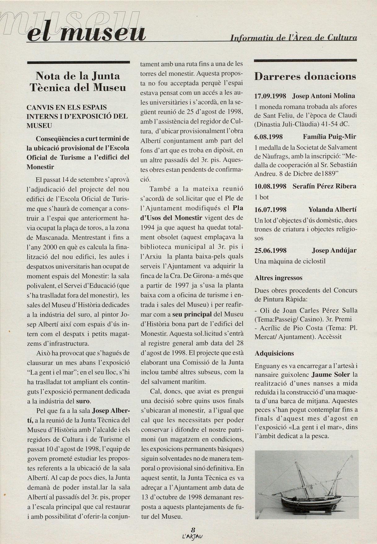 Nota de la Junta Tècnica del Museu sobre canvis en els espais interns i d'exposició al Museu Museu: darreres donacions, altres ingressos i adquisicions