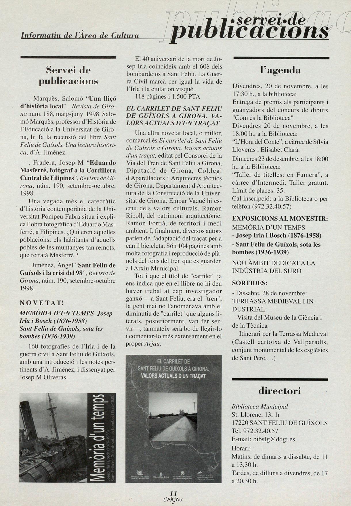 La propera sessió de contes serà el divendres 20 de novembre, a les-ô hores, a la Biblioteca Municipal, també a càrrec de Sílvia Llaveras i Elisabet CIarà. El mateix dia 20, a dos quarts de 7, tindrà lloc l'entrega dels premis del Concurs de dibuix "Com és la Biblioteca?", amb el qual s'ha volgut donar a conèixer la Biblioteca als nens i nenes de Sant Feliu. Els dibuixos de tots els participants s'exposaran durant un mes a la Biblioteca; i a més, els dibuixos dels guanyadors s'exposaran també a laFira del Llibre Infantil i Juvenil, que tindrà lloc a Girona del 25 de novembre al4 de desembre, a la Fontana d'Or (carrer Ciutadans, 19).