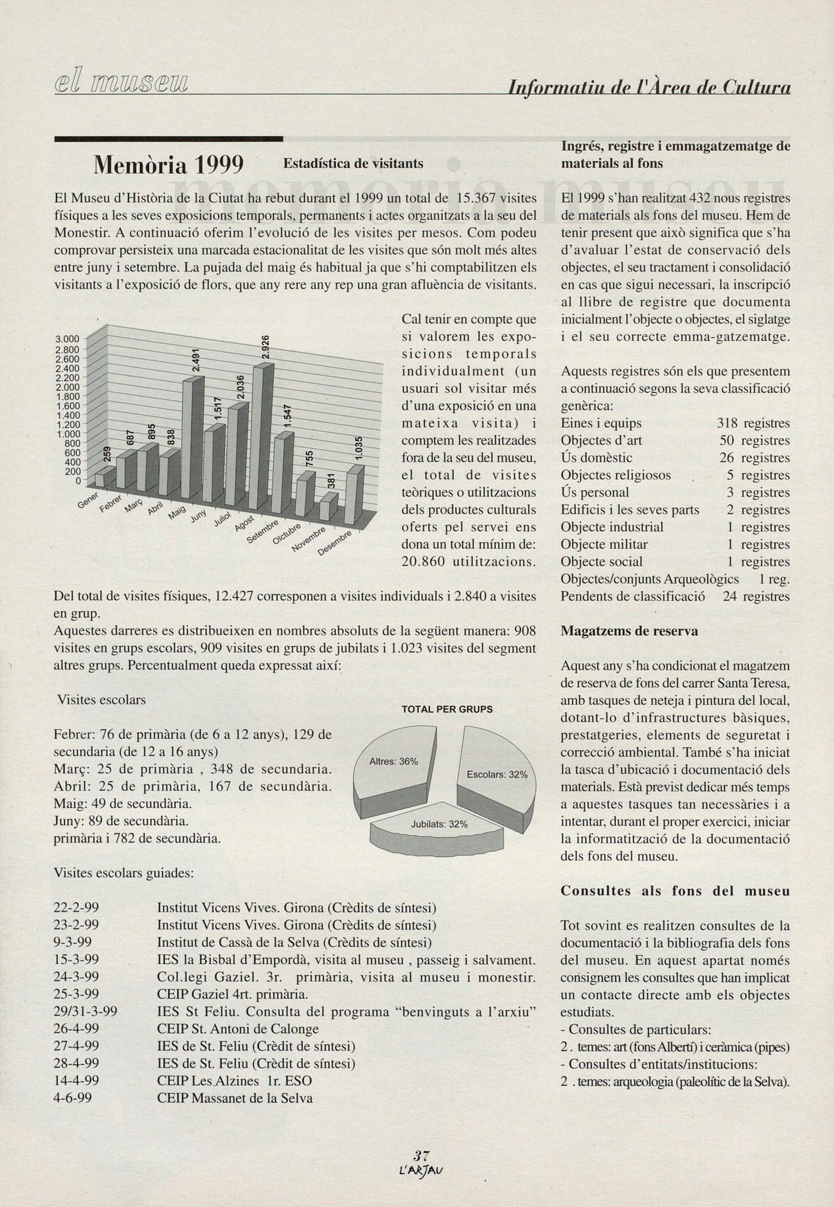 curs 98-99 el museu pago .32 37 Exposicions Assistència al Fòrum de Patrimoni Marítim de la Mediterrània a Gibraltar Una actuació privada ha permès de conservar uri grafit de tipus mariner Grafits apareguts al nostre monestir Darreres donacions Memòria 1999 la biblioteca pago 38 42 L 'Hora del conte: campanya El Racó dels Contes Presentaciô de llibres Novetats Revistes i diaris per al2000 Memòria 1999 Amb la col-laboració de: ,;;� g Diputació de Girona L'M1AV