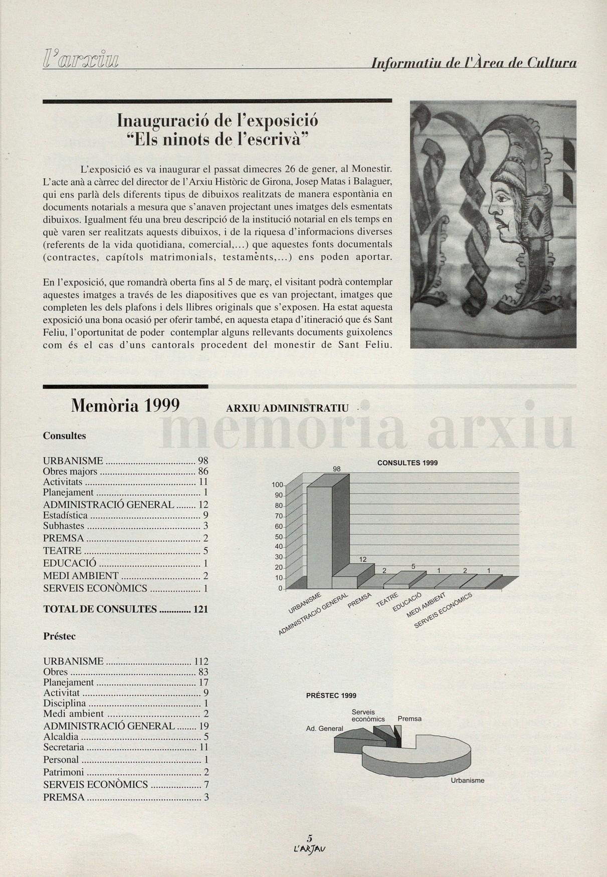 Una anècdota sobre el llibre vermell de l'Ar::áu Municipal Josep M T. Grau Pujol, Documentacióper la història de la marina catalana Lluís Palahi i Xargay, Josep Palahi i Auter Darreres donacions Adquisició delfons Espuña Inauguraciá de l'exposiciá "Els ninots de l'escrivà" Memòria 1999