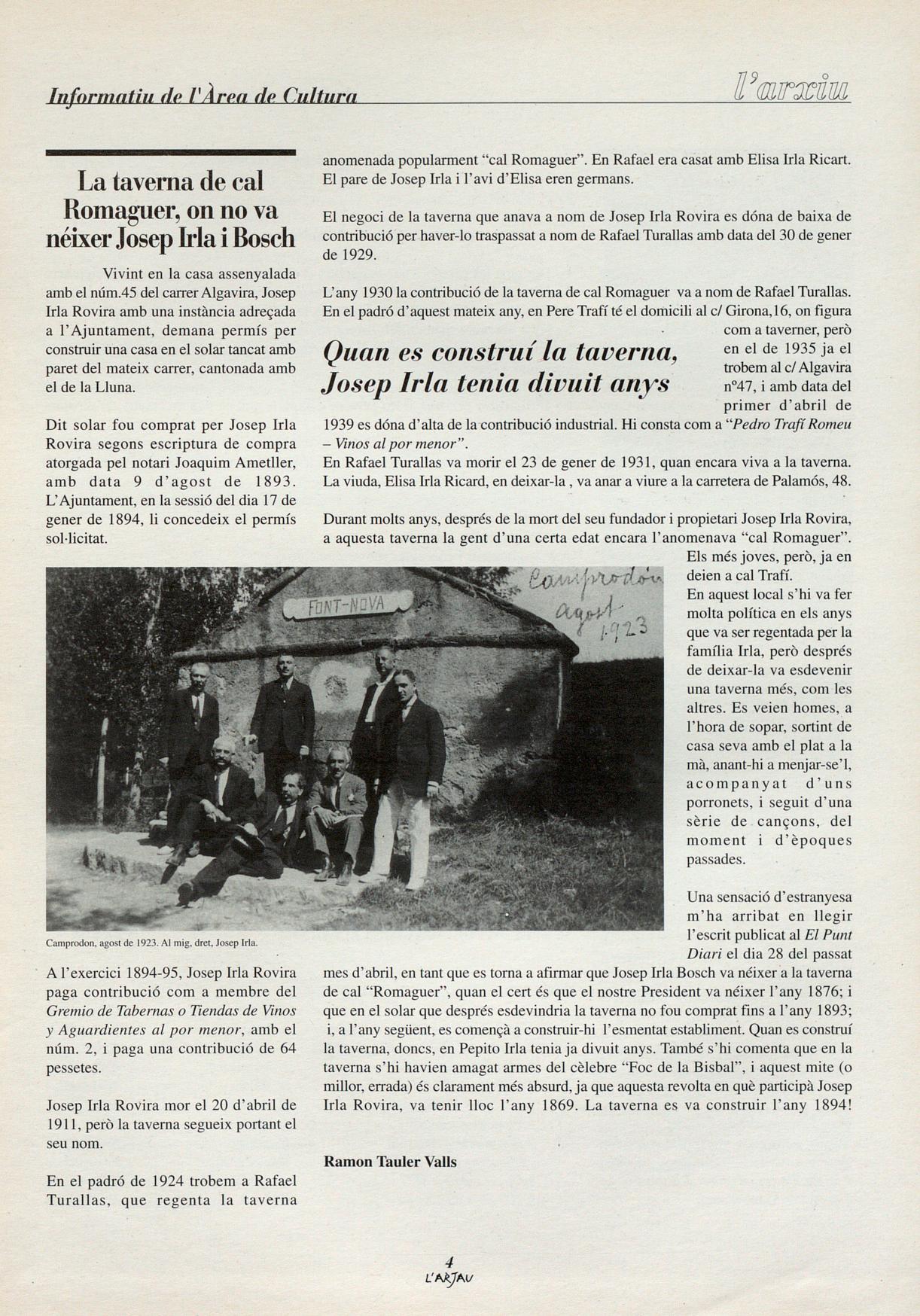 Ramon Tauler; La taverna de cal Homaguer; on no va néixerJosep Irla i Bosch S'ha constituitla Comissió Municipal de Publicacions