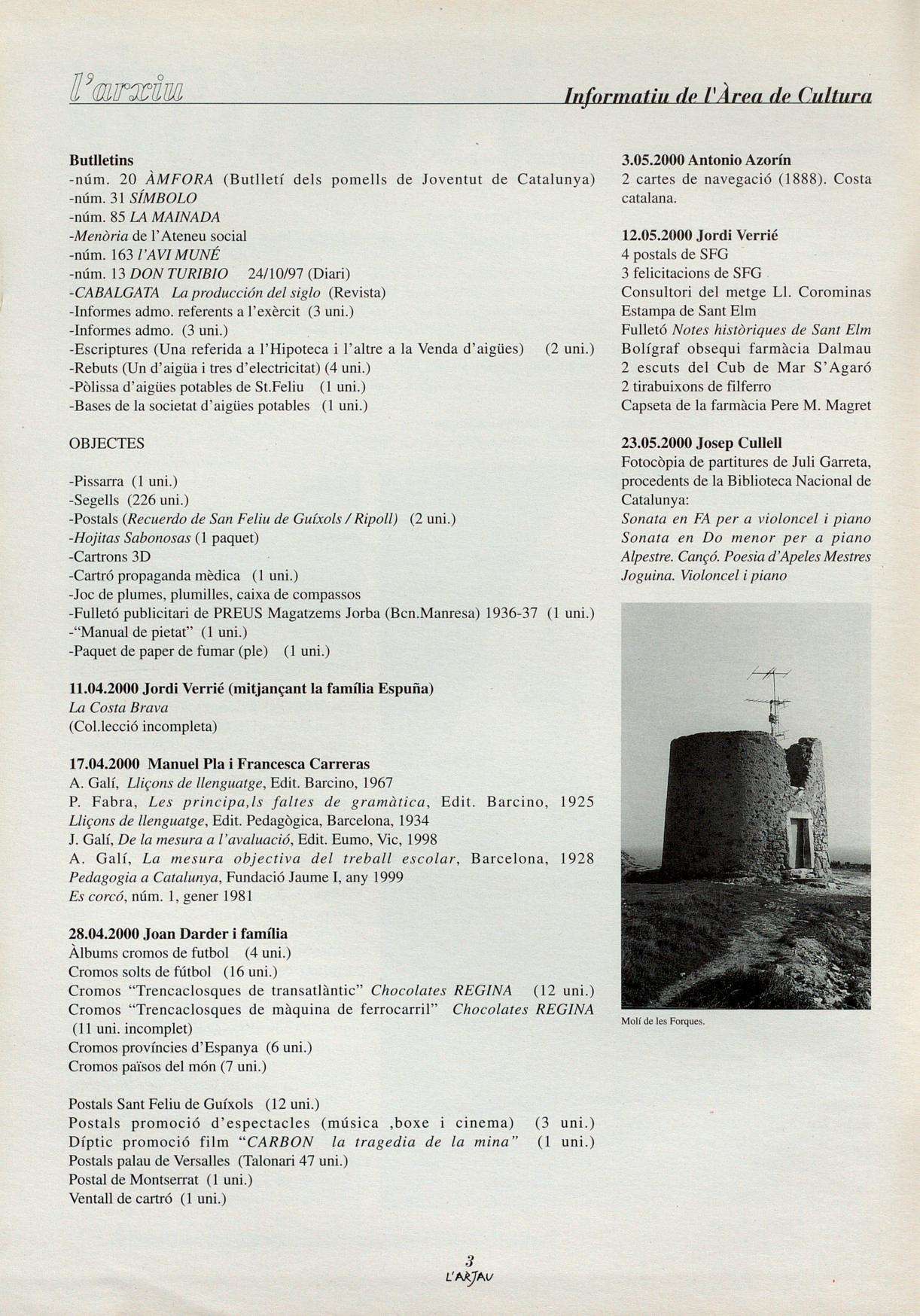 28.03.2000 Pepita Rigau Còpia de 86 fotografies de Pere Rigau Fotografia de Pere Rigau. 2 L'AAJAV Fotografia de Pere Rigau. 4.04.2000 Elvira Cañet Àlbum familiar (16 fotografies) Targes postals i/o fotografies familiars (25 uni.) Postals de fotogrames de pel-Iícules (42 uni.) Estampes (325 uni.) Auques (8 uni.) LLIBRES l BUTLLETINS Llibres -Llibres de poesía (2 uni.) -Almanach "La esquella de la torratxa" 1906 -Alrededor del mundo Saturnino Calleja Biblioteca enciclopedica para niños -Butlletí de la participació d'ITÀLIA en l'exposició de Barcelona de 1929 -Explicación de las láminas murales de catecismo L1ambert Font (PRIMER grado) -Explicación de las láminas murales de catecismo L1ambert Font (TERCER grado) -Cuentos de abuelito (Desfile de historietas) -Manual del Archicofrade 1910 Vida compendiada del BeatAnton Maria Claret PJosep Sirvent -Novísimo resumen de urbanidad para niñas -Memoria de la colonia escolar Diario "El Autonomista" Gerona, 1928.