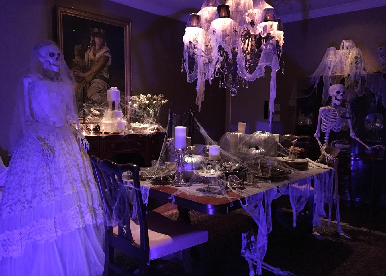 and legs as if it was digging out of a grave. It was all really simple. Then a couple of years later, I happened to come across my mom’s wedding dress that had been sitting in a box since 1957. I put it on one of the skeletons in the dining room and that’s when things started to get out of hand. That’s when the ‘skeleton wedding’ idea was born. The ‘backstory’ is that the whole display is an All Hallows Eve Skeleton Wedding Party. The bride and groom are celebrating at a reception in the dining room while the ‘guests’ are rising from the graveyard outside to come to the party.