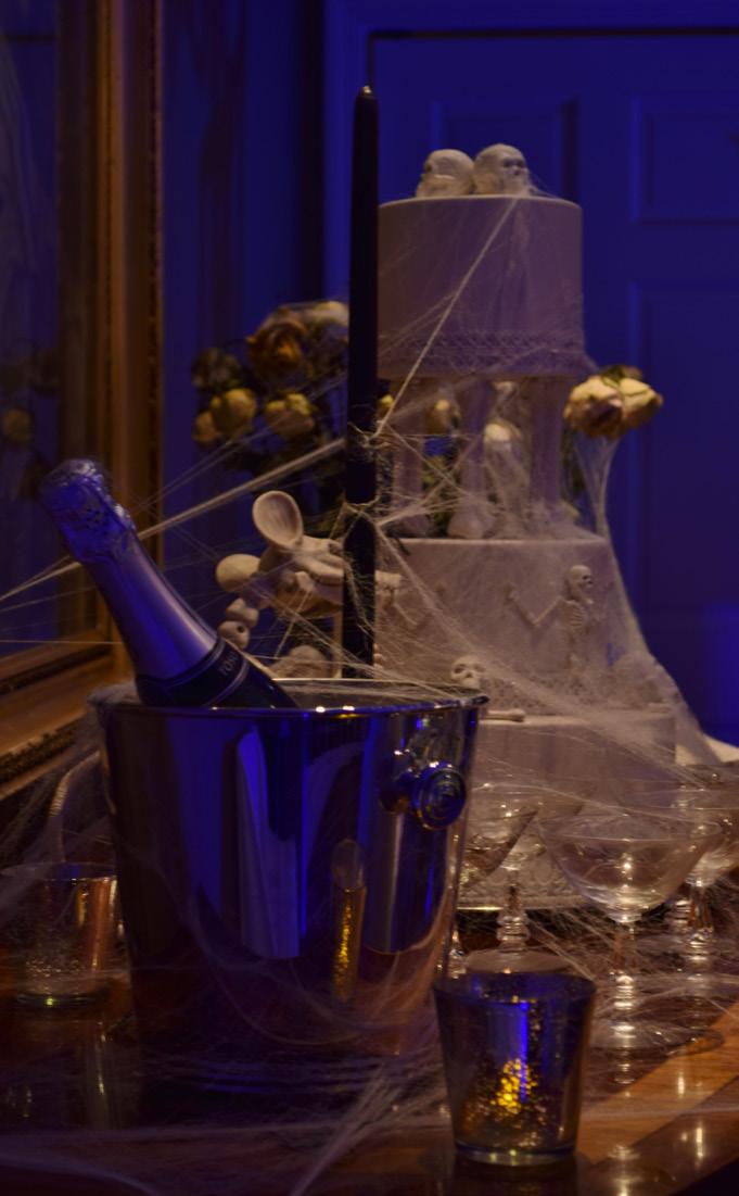 and vines I made from rope and foam insulation spray. Also the faux stained glass window I made by painting Plexiglas. Inside, I really like the wedding cake I made with ceramic bones supporting the top tier instead of the usual Greek columns.