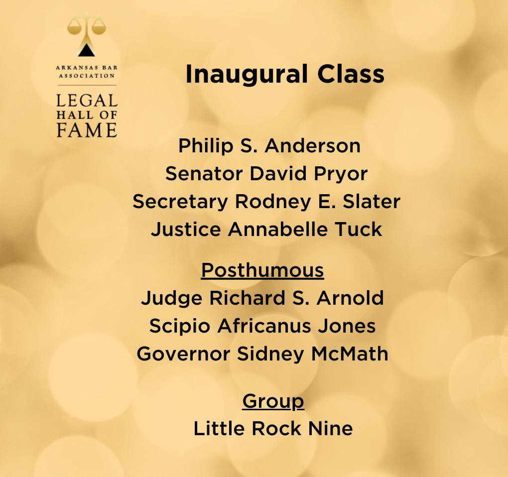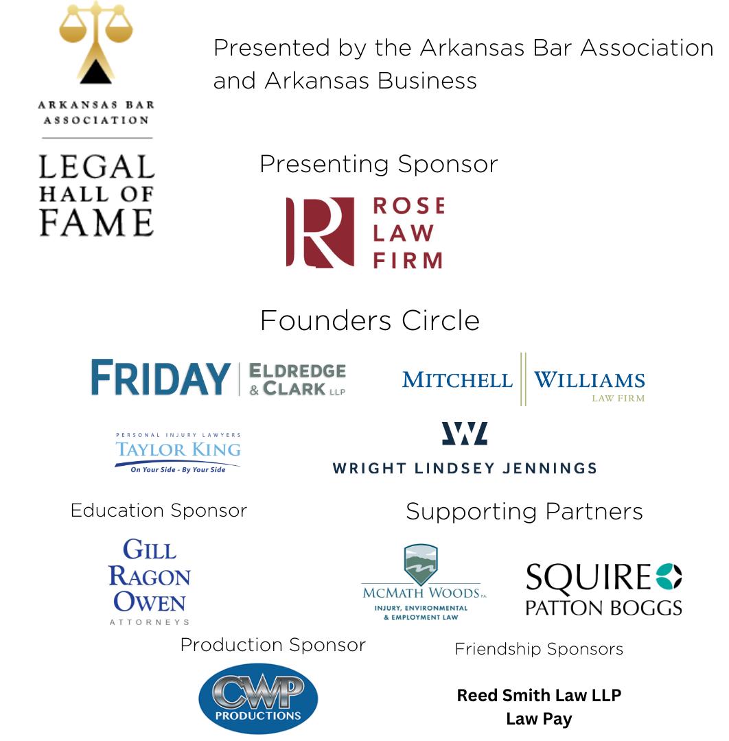 The Association kicked off its 125th year celebration with the Inaugural Legal Hall of Fame on September 15. The event was held at the Arkansas Governor’s Mansion Great Hall with a reception and dinner. Gov. Asa Hutchinson welcomed the attendees, Colette Honorable served as the emcee and President Clinton provided a special video. The Legal Hall of Fame recognized a diverse group of men and women who have made an extraordinary contribution to the law, society, the administration of justice and legal education. Honorees for the inaugural class are: Philip S. Anderson, Sen. David Pryor, Secretary Rodney Slater, Justice Annabelle Tuck, Judge Richard S. Arnold, Scipio Africanus Jones, Gov. Sidney Sanders McMath, and The Little Rock Nine. Thank you to the following sponsors: Rose Law Firm, presenting sponsor; Founders Circle sponsors, Friday Eldredge & Clark, Mitchell Williams, Taylor King and Wright Lindsey Jennings; Supporting Partners, McMath Woods and Squire Patton Boggs; AV/Production sponsor, CWP Productions; Education Partner, Gill Ragon Owen; and our friendship sponsors Reed Smith and LawPay.