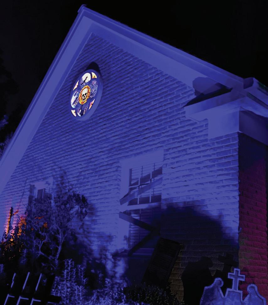 This year, I considered building a church-like steeple or spire topped by a skull and cross bones to go on the roof above the stained-glass window. But I didn’t have the time and I’m always thinking about where am I going to store all this stuff. Who knows. Maybe someday.