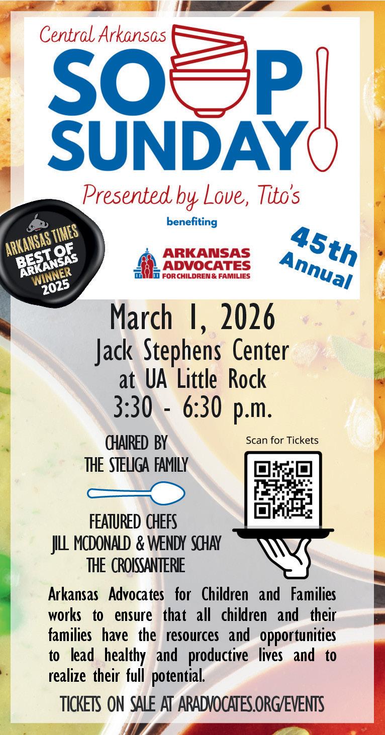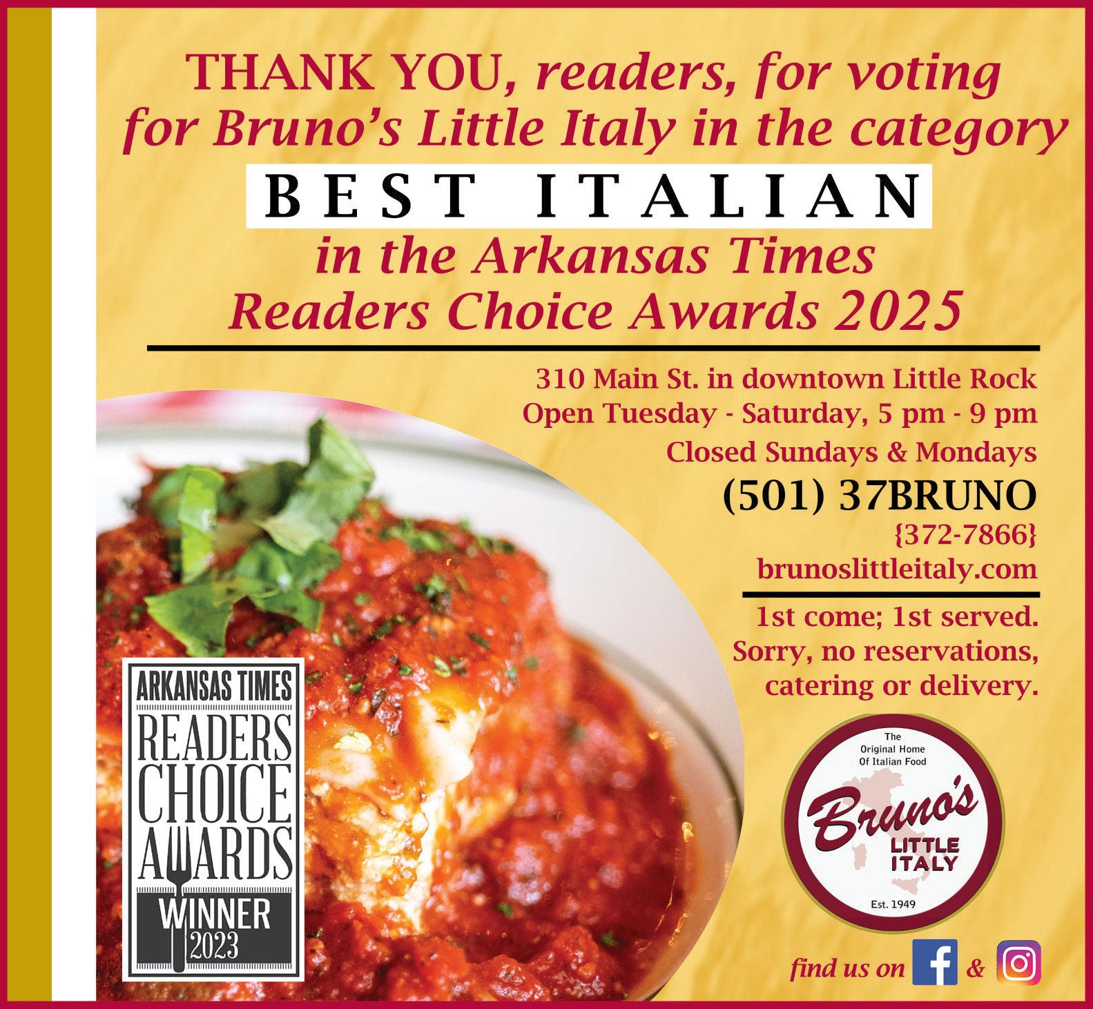 ARKANSAS TIMES (ISSN 0164-6273) is published each month by Arkansas Times Limited Partnership, 201 East Markham Street, Suite 150, Little Rock, Arkansas, 72201, phone (501) 3752985. Periodical postage paid at Little Rock, Arkansas, and ad ditional mailing offices. POSTMASTER: Send address changes to ARKANSAS TIMES, 201 EAST MARKHAM STREET, SUITE 150, Little Rock, AR, 72201. Subscription prices are $60 for one year. For subscriber service call (501) 375-2985. Current single-copy price is $5, free in Pulaski County. Single issues are available by mail at $5.00 each, postage paid. Payment must accompany all orders. Reproduction or use in whole or in part of the contents without the written consent of the publishers is prohibited. Manuscripts and artwork will not be returned or acknowledged unless sufficient return postage and a self-addressed stamped envelope are included. All materials are handled with due care; however, the publisher assumes no responsibility for care and safe return of unsolicited materials. All letters sent to ARKAN SAS TIMES will be treated as intended for publication and are subject to ARKANSAS TIMES’ unrestricted right to edit or to comment editorially.