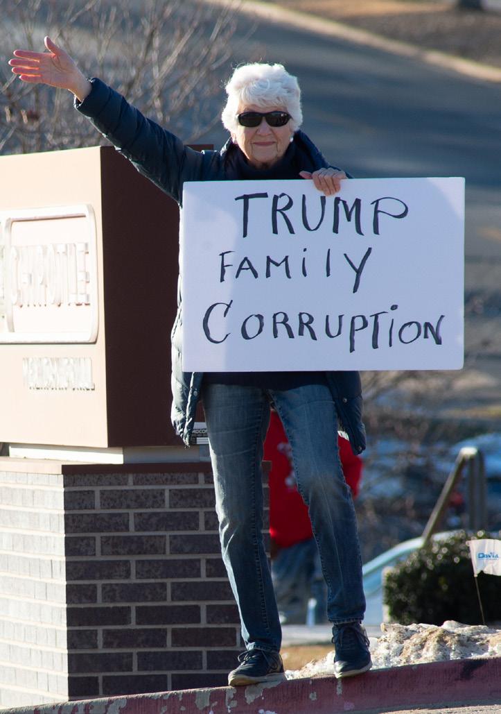 east, there’s a little pull-in there where you’re waiting to turn right, and people will talk to us there. But mostly it’s honking and waving, and people will yell, “Thank you!” We talk all the time about this dopamine rush that you get when people respond. It makes you feel good. I think protest should feel good, if possible.