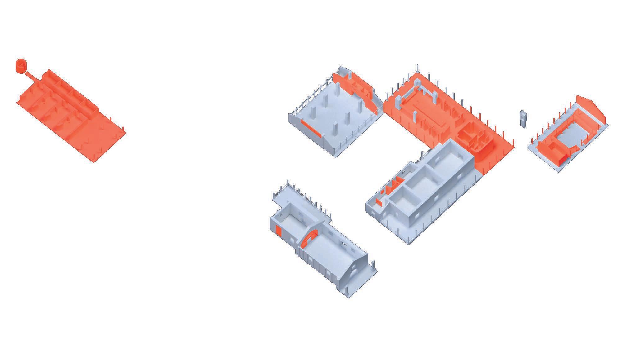Also, in order to provide the new arts and crafts centre with spaces designed for community and artistic use, it was decided to build two new volumes complementary to the three main ones. These, in continuity with architectural languages (rhythms and tectonics of their components and materials), would be located in two areas equally related to the historical evolution of the complex: