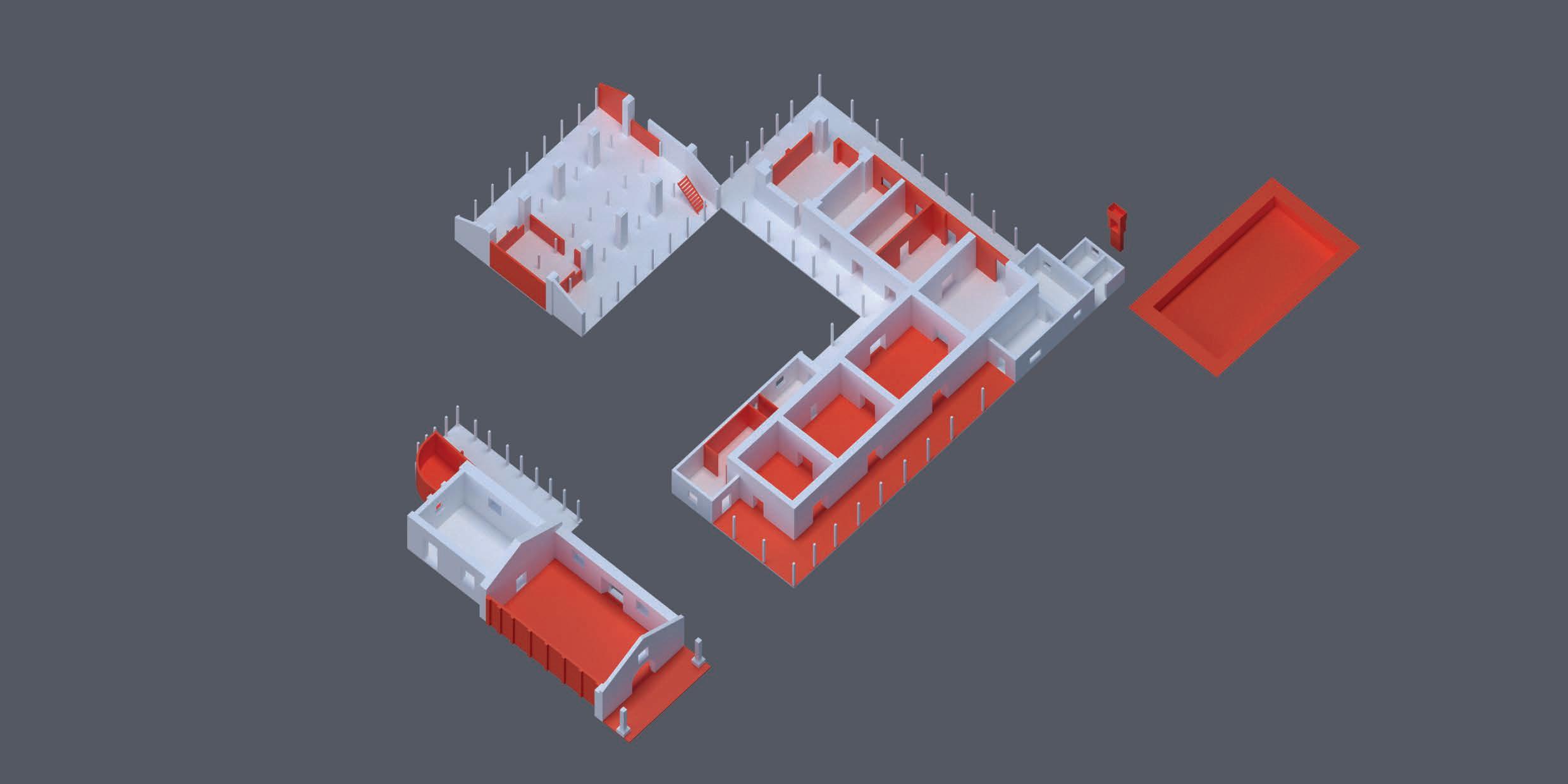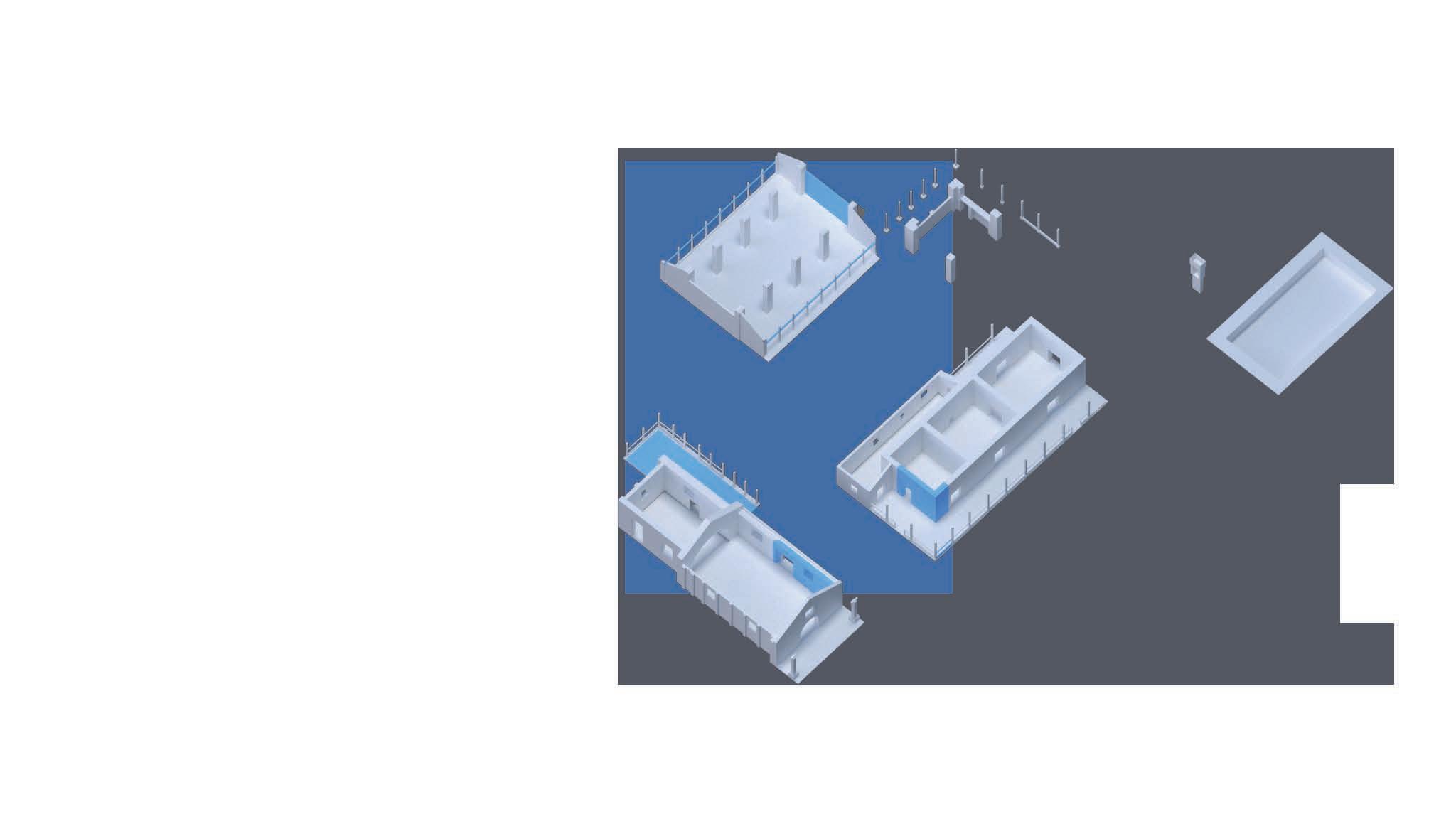 [Figure 63] The new buildings: from abandoned swimming pool to study and consultation room. Graphics by the author, 2022