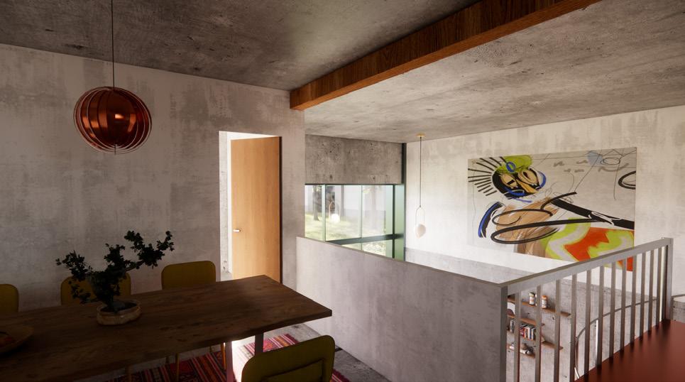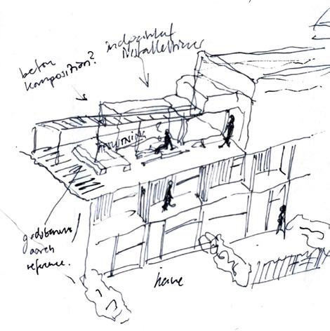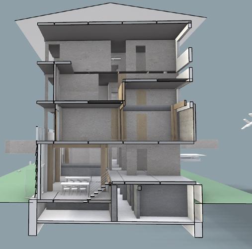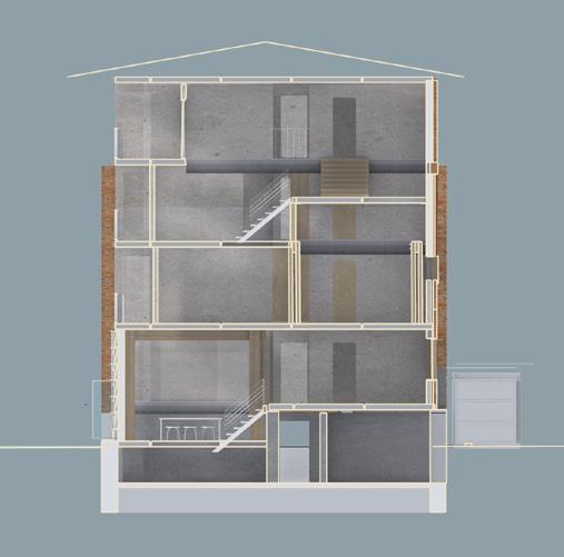 2. sal: sammenlægges med 3. sal. Boliger 2 plan og dobbelthøje rum (Se snit) Tagterasse udstyres med “betonlandskab”/paviloner fra materialebanken, til ophold.