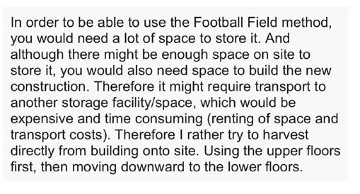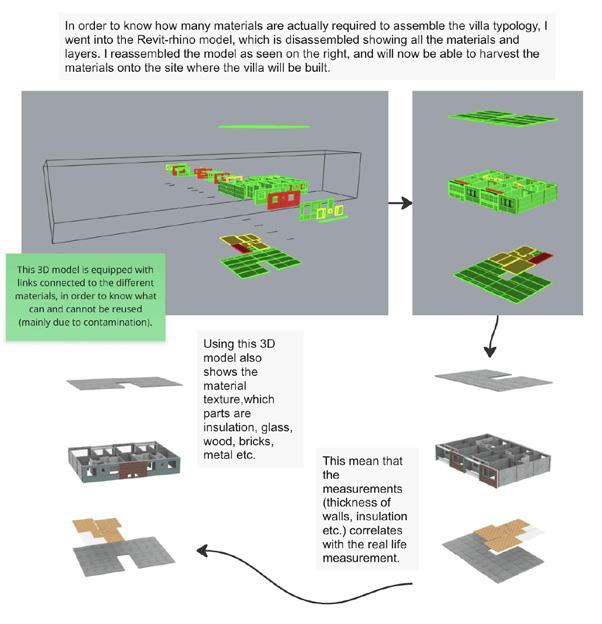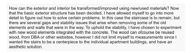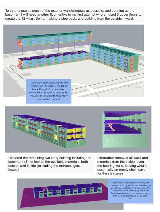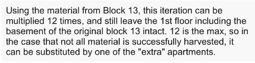 Heraf bliver materialer til direkte genbrug til evt. kvarterhus, rækkehustypologi, pavilloner etc. i gårdrummet foran blok13. Fokus er lagt på transformation efter stillingtagen til “hvorfor overhovedet rive ned?”