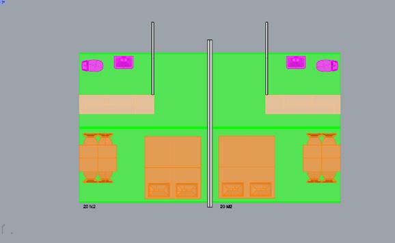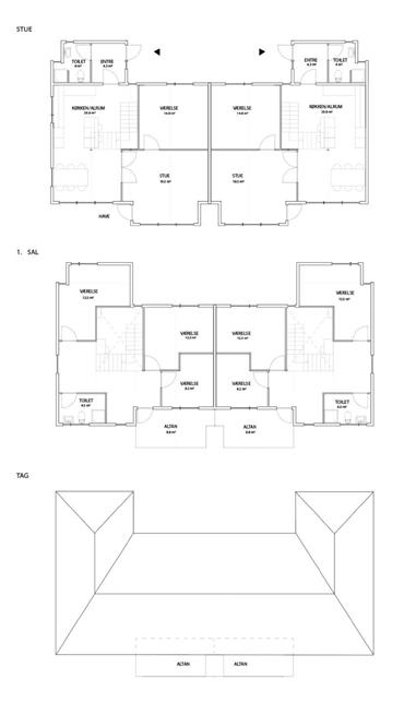 Dobbeltlejlighed, med to etager, spejlvendt af hinanden.