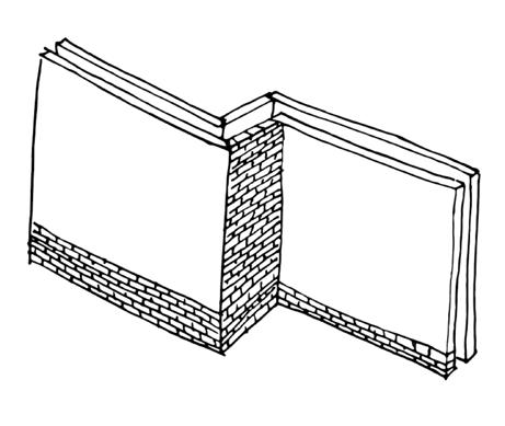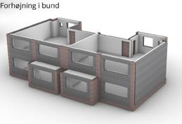 Forhøjelse med mursten under betonelementerne skaber et lettere udtryk og løber som en sokkel eller en fod til betonelementet, men betonens højder kommer til udtryk med bund ved eventuelle døråbninger.
