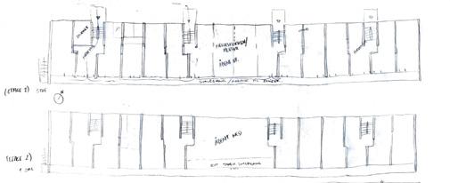 Bottom: Sketches based on the load-bearing structure in the block. 1st, 2nd, and 3rd floors show circulation on the walkway and through apartments, as well as on the roof terrace.