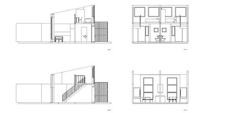 Double apartment with two stories, mirrored off each other. Cut-off slabs to create rectangular apartments combined into square units.
