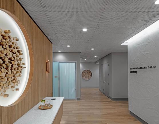 The BioMed Center - New England is a state of the art facility for treating patients in medicine and dentistry designed by DBVW Architects in collaboration with Mark Lawton Architecture. They combined Arktura’s cutting edge technology with a biophilic design meant to connect patients to nature as a part of a holistic approach to healthcare. Three of Arktura’s products clad the clinic’s spaces. Atmosphera® Swell with an organic, gentle wave undulates above in the kitchen and nourishment area. SoundStar®, combined with wooden pendant lights, brings visual interest and dynamic geometry to the dental practice. Vapor® Cluster Dense, field trimmed to the clinic’s unique circulation, provides a unique ceiling element as patients walk around. The symbiotic relationship and dialogue created between the three systems communicate a comforting ecocentric environment.