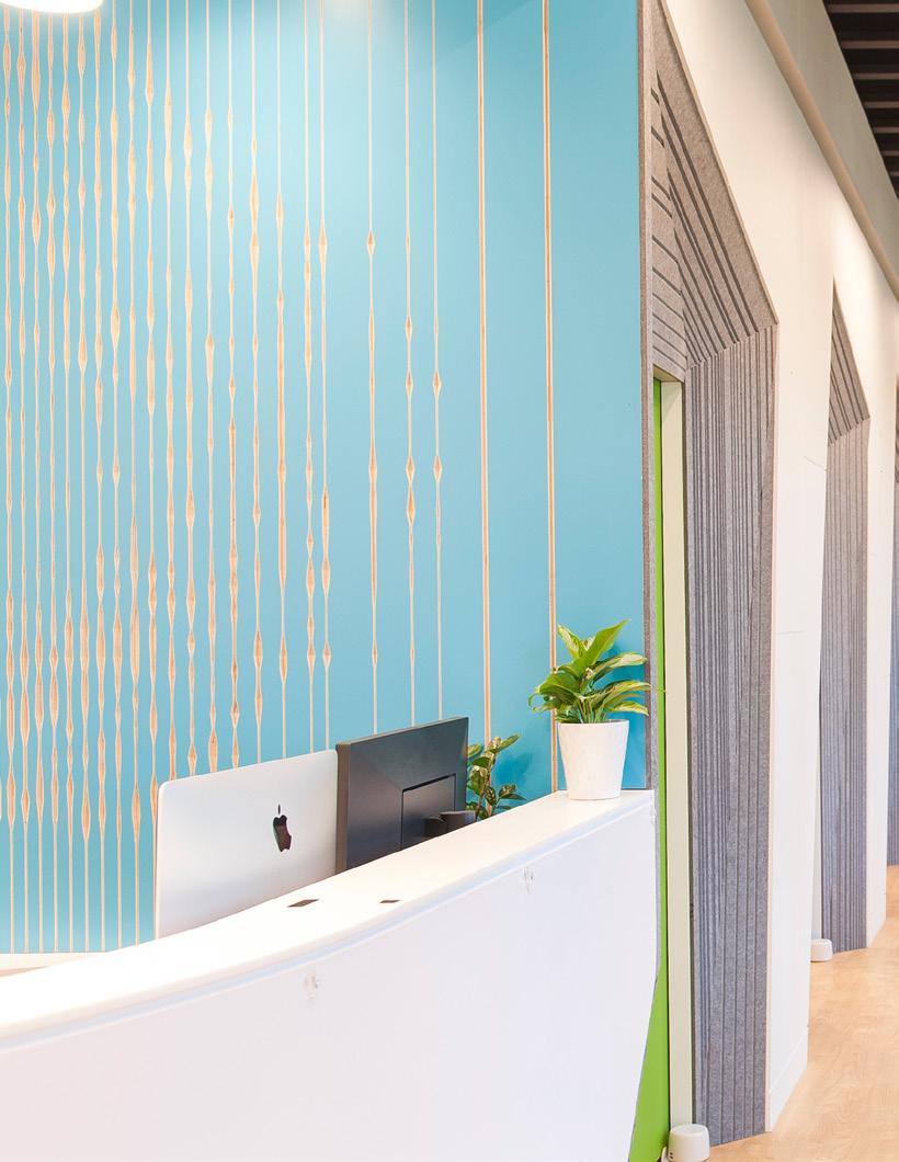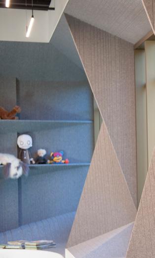 Synthesis Design and Architecture collaborated with Arktura’s Solutions Studio® to design and fabricate custom grooved geometric Soft Sound® through Dr. Ying Peng’s office. The acoustic wall-cladding system was thoughtfully integrated into surrounding windows, cascading into bench-like seating surfaces, and lessening the austere doors of the YPMD Pediatric Neurology Clinic. The grooves in the panels manage the sound of children playing. Simultaneously, the panels’ soothing heather grey color tones and soft tactile quality transform a commonly sterile and uncomfortable medical facility into a protected, inviting, and calming environment while entertaining and encouraging the wonder and creativity of its young patients and their families.