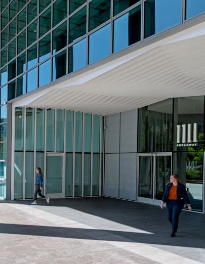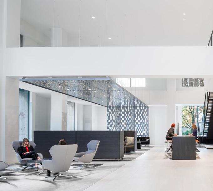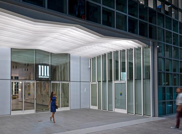 The reimagined lobby of 1111 Broadway by RIOS engaged visitors and tenants by providing seating, a private patio, and landscaping and increasing access to retail. The materials used add warmth and create a welcoming environment. A custom Atmosphera® Analog 3D adds a geometric, faceted texture to the space.