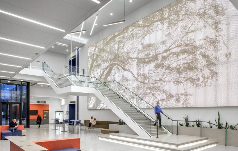 Kirkwood’s new Performing Arts Center is a 5,000 sqft community space, intended to host art galleries, theater performances, festivals, and other events. Inspired by Kirkwood’s certification as a Tree City USA , the space incorporates nature through a wall installation that spans two floors depicting an image of a tree canopy through backlit Vapor® Graphic Perf® panels. Upon its grand opening, KPAC will be a home for artistic endeavors and the community.