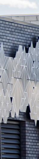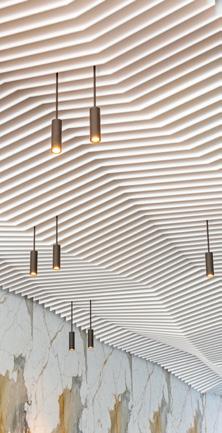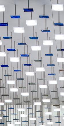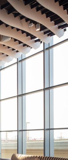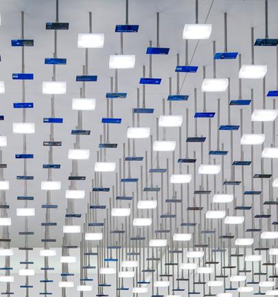 This Melrose Avenue, West Hollywood Lululemon location prominently features a Solutions Studio® custom exterior facade, designed and manufactured by Arktura, in collaboration with Lululemon. This unique shell wraps around the storefront and incorporates both hard geometric lines and a subtle organic mountainscape silhouette. Entering the store’s 2,700-squarefoot Quadrangle Architects designed shopping space, you’ll find Arktura Atmosphera® Pulse ceiling modules suspended above areas, including the cashier counter, which are seamlessly integrated with lighting elements of the space. The realized design affords a clear exterior brand identity and acoustic attentuation of the interior.