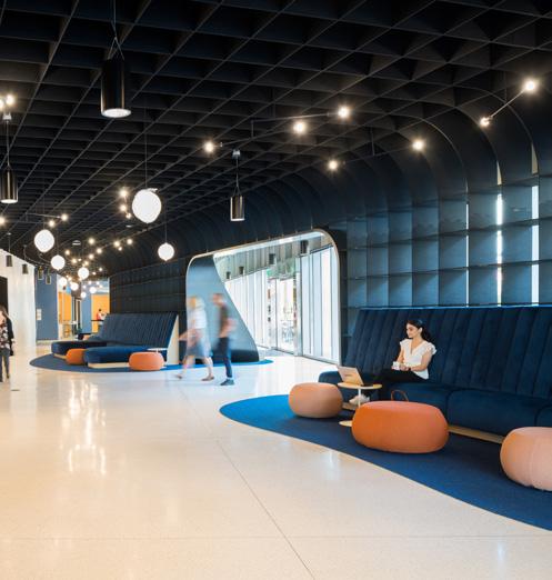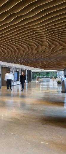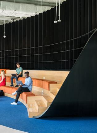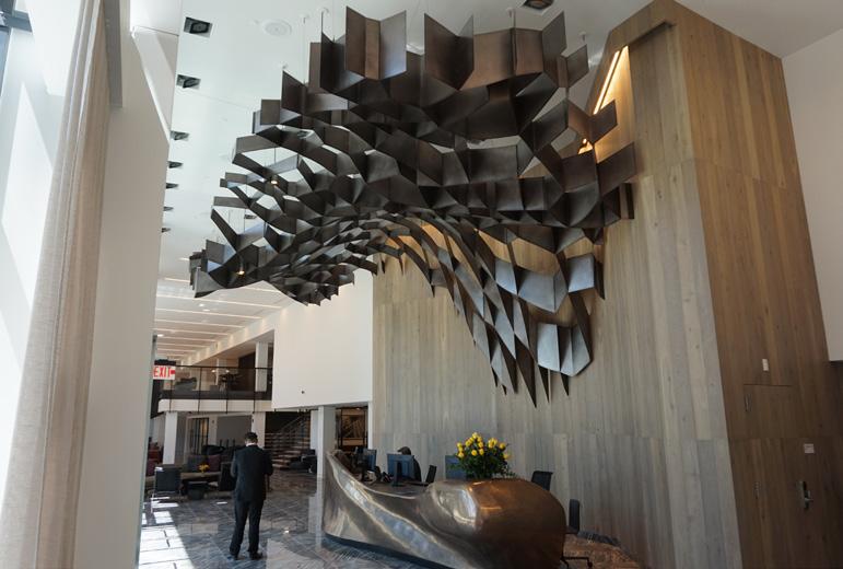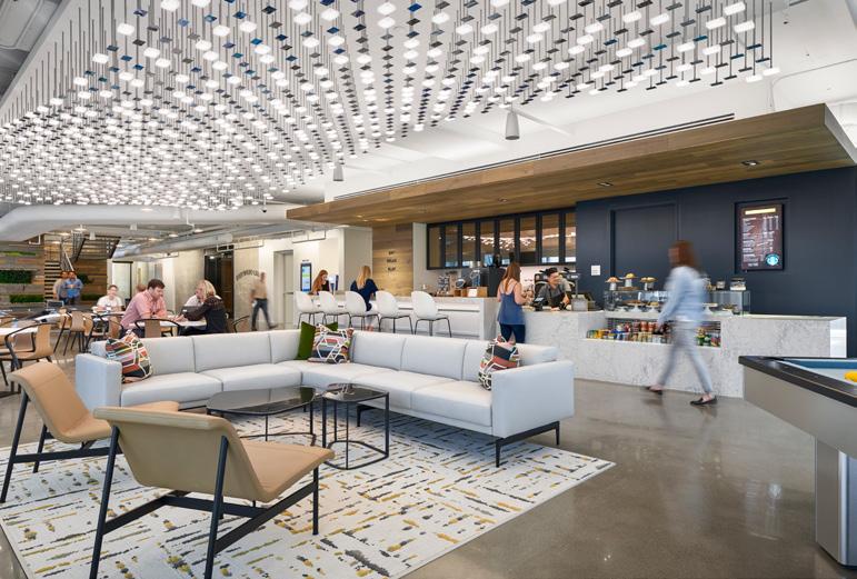 This ambitious project is highlighted by two striking custom design features. A large-scale “Geo Wall,” bespoke faceted wall panel system comprised of hundreds of triangular panels is complemented by an expansive acoustic baffle system with a biophilic wood texture. These undulating ceiling baffles provide sound attenuation and add movement to the space, creating a visual and acoustic balance between the “Geo Wall’s” polished metal aesthetic and the baffles’ warm wood tones.