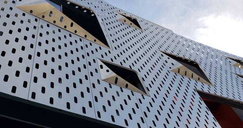 Los Angeles-based firm Warren Techentin Architecture enlisted Arktura to design and manufacture its Elysian Fields exterior feature facade. The cladding comprised of Exterior Graphic Perf® designed in tandem with Arktura’s Solutions Studio® to pay homage to nearby automotive body shops. The perforated and formed aluminum panels gently curve along Sunset Boulevard providing protection against the harsh sun. It supports flared voids to allow the inclusion of expansive sliding windows for the residences within. In keeping up with the everchanging eclectic character of Los Angeles, this project provides a parametric poem of perforations to the neighborhood it graciously nests within.