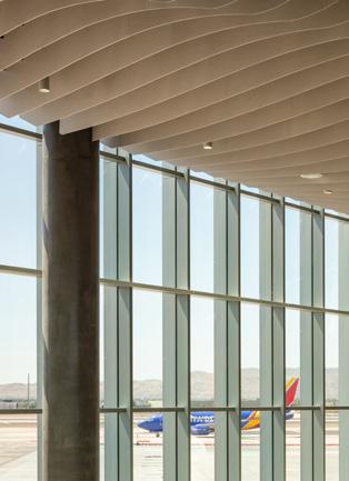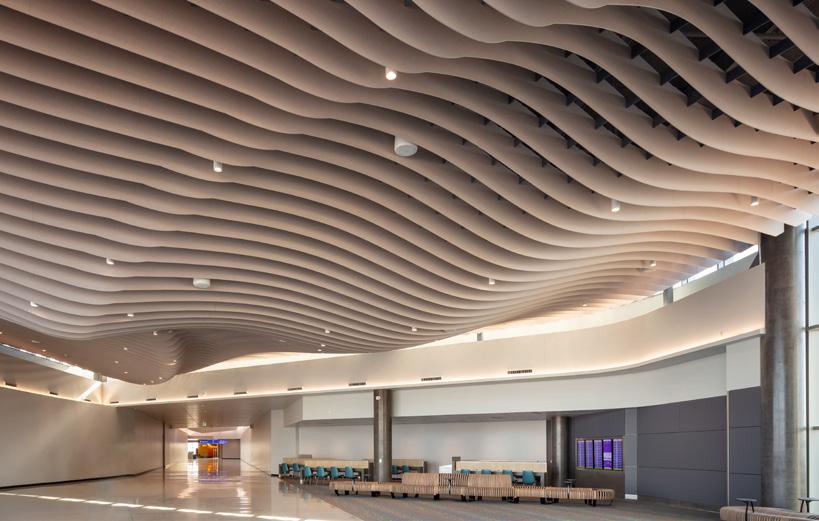 Phoenix’s Sky Harbor, “America’s Friendliest Airports”, and one of its busiest, recently opened a new Terminal 4 concourse. Arktura’s Solutions Studio® team of designers, in partnership with Corgan Arizona, crafted a stunning, massive-scale, suspended acoustic ceiling installation. With the design language inspired by the nearby Imperial Sand Dunes, these massive undulating acoustic fins were custom-made of Arktura’s Soft Sound® acoustic material and constructed up to 8-9ft deep in a natural and neutral tone finish that drew inspiration from the surrounding desert. Initially based on an adaptive Atmosphera® system, the scope was retooled into a custom project to fulfill the scope and scale of the finalized space. The custom baffles effectively mitigate excess noise throughout this busy terminal, providing travelers with a quiet and peaceful experience. This acoustic undertaking was part of a larger-scale project to help increase traveler wellness at one of the nation’s busiest airports.