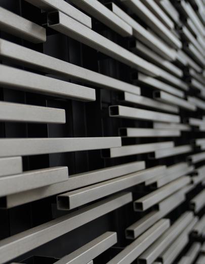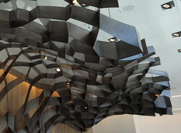 This cellular structure invented by Arktura for Frameworks, Dallas, builds on specialized algorithms and new manufacturing strategies developed for earlier Solutions Studio® projects and represents a dynamic leap forward in manufacturing and design capabilities. The kiosk’s complex double curvature was achieved through uniquely formed planar surfaces, laser cut and sculpted on an eighteen-axis metal forming machine, and assembled with a total of 9,500 rivets through 14,000 points of alignment. The cell apertures vary in size, allowing gradations in light to accentuate the display areas, while the tapered form organically defines a point-ofsale location. Arktura’s exceptionally precise execution and comprehensive planning allowed this self-supporting kiosk to be prefabricated off site, shipped as a system and assembled in a matter of days.