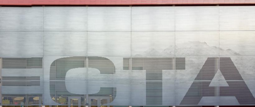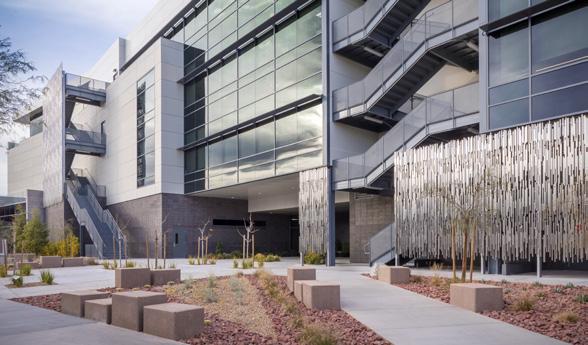 Southeast Career Technical Academy, a magnet public high school in Nevada, required a facade to protect its students and its building from the Las Vegas heat. Simpson Coulter Studio sought out Arktura to design an exterior system that would provide sun-shielding and evoke pride by incorporating the school mascot’s image - the roadrunner - and signage for SECTA’s campus. The stunning rendition of the imagery was made possible by Arktura’s Graphic Perf®, which uses proprietary software to render tonal variations in perforated panels. The resulting exterior mimics higher-educational campuses and provides ample natural light within its learning spaces.