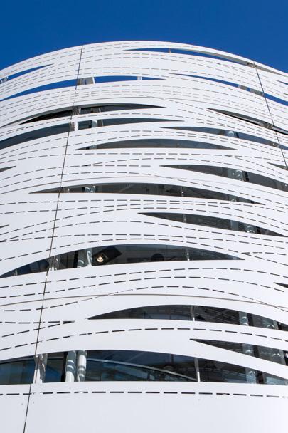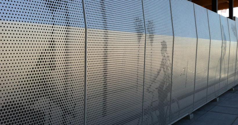 Artistic perforated panels create shade and a reprieve from wind for crossing pedestrians.