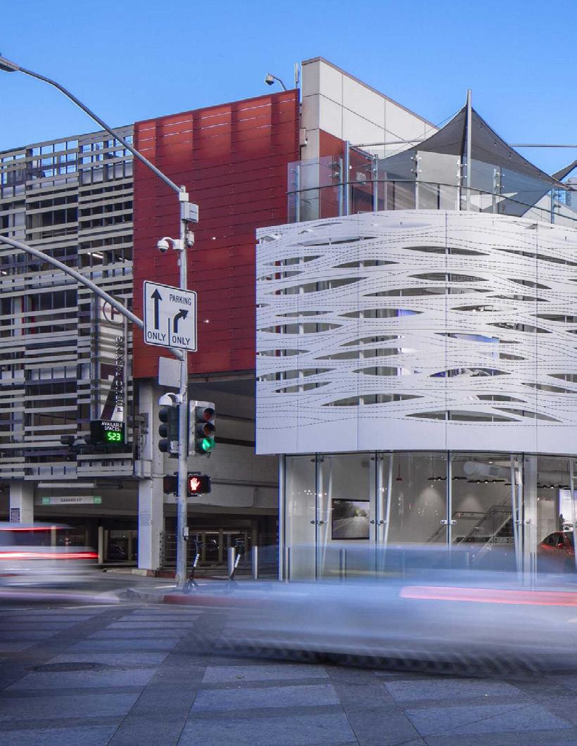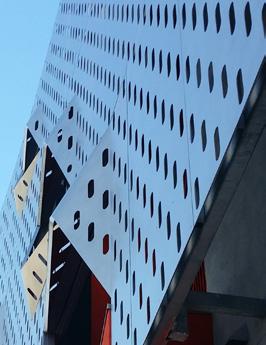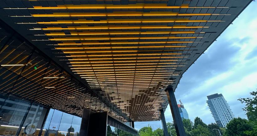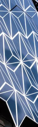 Tishman Speyer commissioned Iwamoto Scott Architecture to redesign the main entrance, lobby, and plaza of 160 Spear. This intent included a geometric canopy that made an inviting plaza while also providing shelter from rain and sun. In addition, architects wanted to carry the hour-glassshaped faceted interior lobby to the exterior. They enlisted the help of Arktura’s Solutions Studio® Team to bring their intent to reality. The resulting combination of Fin, Cladding, and Faceted Panels combined to create a monolithic field uninterrupted. It breaks the exterior barrier and seamlessly flows into the dynamic lobby and plaza of 160 Spear. “