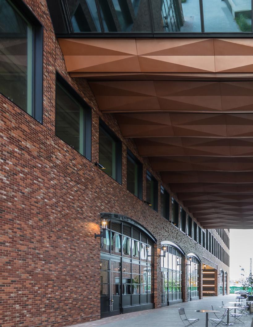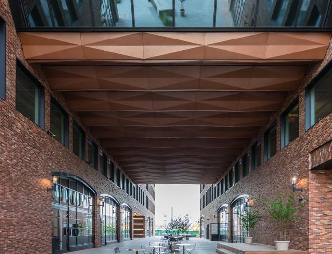 25 Kent is a new office building that was developed through a partnership between Gensler and Hollwich Kushner as a hub of innovation and creativity. Designed as two volumes that are reflections of each other with a plaza cutting a void through the middle, Arktura provided a custom size and finish Delta Drop® and custom finish of Vapor® panels to clad the outdoor plaza, adding to the industrial feeling of the building.