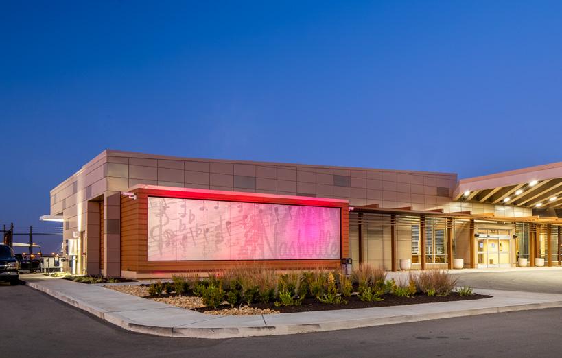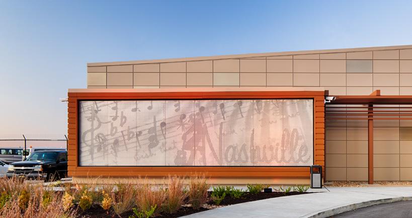 Signature FS unveiled their new FBO terminal at Nashville International Airport, featuring numerous systems and solutions by Arktura. Travelers and pilots are greeted upon arrival with an extensive Graphic Perf® Custom Photoreal Exterior treatment, paying homage to Nashville’s iconic music legacy. The vivid illumination used in the exterior application provides a preview of Signature’s thoughtfully presented artifacts by musicians and celebrities displayed within the terminal.